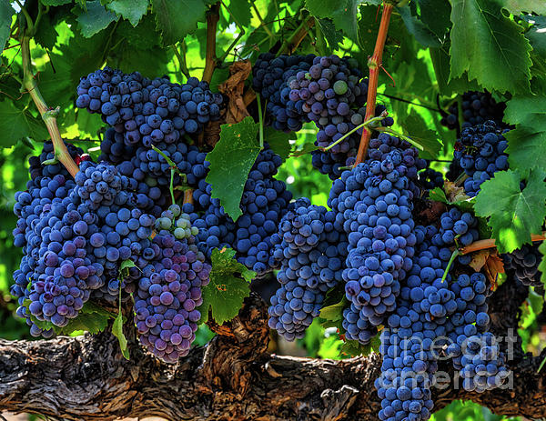 Before any vineyard can make wine, it must grow the most robust grapes. Clusters of juicy Grenache grapes nearly burst from the vines, their deep purple skins ready to create a fruit-forward wine that will bring everyone together in harmony. The colorful grapes stand out further with the greenery surrounding them, an epic photo ideal for displaying in wine bars or home bars alike.